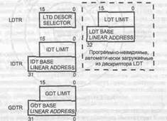 С каждой из этих таблиц связан соответствующий регистр процессора Регистры GDTR и IDTR имеют программно-доступное 16-битное поле лимита, задающее размер таблицы, и 32-битное (у 80286 — 24-битное) поле базового адреса, определяющее положение таблицы в пространстве линейных (у 80286 — физических) адресов памяти. У регистра LDTR программно доступно только 16-битное поле селектора, по которому из GDT автоматически загружаются программно-невидимые поля базового адреса и лимита.