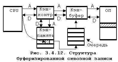 Между кэш-контроллером и ОП располагается кэш-буфер, имеющий очередь, как на запись, так и на чтение. Если требуется прочитать блок, который находится в кэш-буфере в очереди записи, то кэш-буфер переписывает измененный блок из очереди записи в очередь чтения, т.е. это как бы еще один уровень кэширования.