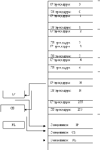 2) в регистры IP и CS помещается новое содержимое (адрес процедуры прерывания), которое определяется типом прерывания и извлекается из предопределенных ячеек памяти, определяемых типом прерывания;
