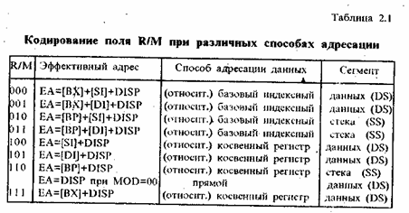 2) в случае, когда поле MOD равно 01 или 10, задается относительный способ адресации операнда в памяти соответственно со смещением один (DISP-LO) и два байта (DISP-LO, DISP-HI); какой из относительных способов адресации (базовый индексный или индексный) используется, а также к какому сегменту (стека или данных) будет осуществлено обращение, определяется полем R/M (см. табл. 2.1);