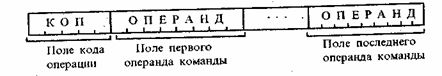 Команды процессора располагаются в памяти (ОЗУ или ПЗУ) в виде последовательности битов, длина которой кратна 8 битам (байту). В свою очередь каждая команда разделяется на группы битов или ПОЛЯ, причем поле кода операции (КОП) показывает что должен делать процессор, а остальные поля, называемые операндами, определяют требуемые команде данные (рис 2.1). Операнд может содержать непосредственное данное (число, входящее непосредственно в команду) или адрес данного в памяти.