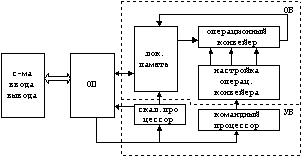 Из этой схемы видно, что для орг-ции векторно-конвейерной обработки данных требуется поддрежка специализированных процессоров, в данном случае 2-х: скалярный процессор, потому что не все задачи сводятся к векторной обработке, и к-ндный процессор, к-рый обеспечит настройку операционного конвейера, помните мы говорили, чт.е. сцепление данных, есть распределение данных; в состав самого конвейера могут входить те или иные ф-циональные устр-ва, необязательно все, т.е. считайте вот стоит конвейер и здесь, предположим, 15 устр-в некие из них можно удалить, а соединить их в том порядке к-рый требуется для выполнения векторных операций, более того в более сложных случаях можно организовать несколько параллельно-ф-ционирующих конвейеров. И все это делает устр-во настройки, для этого требуется выполнение специальных к-нд, к-рые будут перенастраивать конвейер для векторной обработки данных.
