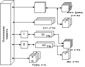 Нарисуем 3 регистра упр-ия – вектор маски, вектор режимов и счетчик тактов. Далее оказывается, что все эти векторные ф-циональные устр-ва явл. устр-вами целочисленной арифметики, а нам требуется еще выполнять операции с плавающей точкой. Поэтому рисуем еще ф-циональные устр-ва с плавающей точкой: сложение (имеет 6 стадий), умножение (7 стадий) и вычисление обратной вел-ны (14 стадий). Они не участвуют в образовании конвейера для сцепления и разветвления данных и заведомо имеют разное время вычисления, к-рое, в том числе, зависит от конкретных значений данных, но сами они строятся по конвейерному принципу. Поэтому обмена м/у ними не рисуем. Скалярная часть состоит из 8 скалярных 64-х разрядных регистров: S0-S7. Скалярных ф-циональных устр-в имеется всего 4: сложение, логические операции, сдвиг и подсчет единиц. Понятно, что скалярные устр-ва берут свои данные из скалярного регистрового файла, где имеется 8 регистров. Также имеется 8 адресных 64-х разрядных регистров: А0-А7. Имеется 2 адресных устр-ва: сложение и специализир. умножение (на целочисленную константу). Имеется 4 буферных блока памяти, называемые буфером к-нд. Фактически, одновременно в этом векторном процессоре находятся 4 фрагмента к-нд, а сами буфера м/б разделены на части. Это фактически кэш-память к-нд. Т.е. наиболее часто используемые фрагменты к-нд находятся в местах этой буферной памяти и более того реал-ся опережающее чтение фрагментов кода для последующего их выполнения процессором, в том числе, как скалярных, так и векторных. Каждый буфер содержит 64 16-ти разрядных слова. В среднем 24 к-нды помещается в каждом из буферов. Также ставили кэш-память данных для каждого из групп регистров: Т и В.