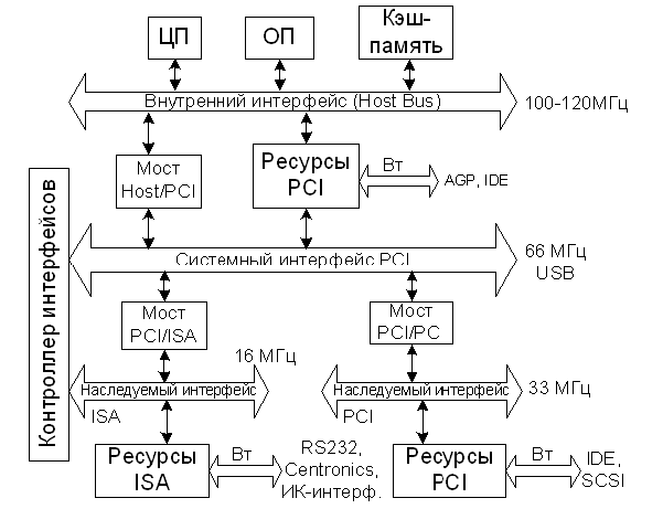 PCI с тактовой частотой 33МГц – наследуемый интерфейс, с пропускной способностью 132Мбит/c. К этой шине подключаются медленные устройства.