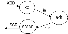 Код этой программы следующий: параллельно запускается процесс редактора. Ему в качестве параметра передаются 2 канала: входной и выходной. Далее запускается драйвер клавиатуры, которому передается канал от оборудования и входной канал. И запускается 3 канал, к-рый получает рез-тат обработки данных редактором. Эти процессы могут тоже, в свою очередь, порождать процессы: например редактор может порождать процесс, занимающийся формированием какого-нибудь окна.