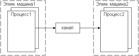 Каждый процесс существует на отдельной элементарной машине. На одной элементарной машине может быть несколько процессов.