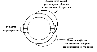 Каждое регстровое окно содержит комплект регистров общего назначения доступных подпрограмме. В области перекрытия размещаются регистры, которые служат для передачи параметров между подпрограммами и возврата результатов из подпрограмм. Таким образом обеспечивается связь подпрограмм с различной глубиной вложенности. То есть оказывается, если у нас есть m комплектов регистров, то значит наш процессор может реализовать вызов подпрограмм с глубиной вложенности не более чем m. Когда происходит переполнение кольцевой памяти, возникает ситуация, называемая переполнение, освобождаются один или несколько банков в основную память и процесс вычисления продолжается, но тестирование различных кодов написанных для различных задач привели к установлению интересной закономерности: если мы возьмем некий конкретный уровень заполнения этой кольцевой памяти, то окажется что внешний вид объема памяти который необходим для хранения адресов возврата параметров, которые передаются в функции и возвращаемого, результата за произвольно взятый какой-то длительный интервал времени умещается в кольцевой памяти и только редко происходит переполнение этой памяти. То есть оказывается полная глубина вложенности испльзуется редко, а в основном глубина вложенности такая, что выбрав объем кольцевой памяти равным 8 банкам мы обеспечиваем 90% вызовов подпрограмм, то есть 90% вызовов подпрограмм обеспечивается без сохранения части этой кольцевой памяти в основной.