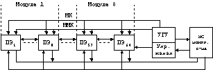Имеется линейка 8 модулей по 8 ПЭ. Также есть магистраль команд(МК), которая используется для передачи команд на ПЭ. Есть хорошее архитектурное решение в этой системе: оказывается в модули ПЭ передаются определения некоторых команд в виде микрокода, т.е. помните, мы говорили, что состоит запоминающее устройство, которое получает микрокод или микропрограмму для исполнения тех или иных команд, которые передаются по МК. Поэтому рисуем еще одну магистраль – магистраль микрокоманд(ММК). Т.е. есть базовый набор команд, но можно задавать с помощью микропрограмм новые команды. Имеется двухнаправленный регулярный канал( РК) для передачи данных между соседними ПЭ. Данные поступают из мониторной системы. Имеется два независимых канала при магистрали ввода и магистрали вывода. Мониторная система – это какой-нибудь персональный компьютер. Матричная система не является самодостаточной, она встраивается, как некий блок в ВС универсального назначения. Она обеспечивает загрузку данных в локальную память ПЭ и организует работу УГУ.