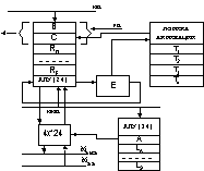 Есть блок регистров, называемых регистры арифметико-логического устройства:В,С,R0,..RF. Эти регистры 24-х разрядные. Они подключаются к АЛУ. Понятно, что регистры В и С участвуют в обмене по регулярному каналу. Имеется специальный регистр Е, называемый регистром расширения для выполнения операций с двойной точностью, то есть 48 разрядов. АЛУ имеет вход с модуля микрокоманд и фактически операции АЛУ изменяются. Имеется память 4 кБ 24-х разрядовых слов. К этой памяти подключается магистраль ввода и магистраль вывода. Имеется 14 разрядное АЛУ для адресной арифметики, которая управляется на уровне микрокоманд и позволяет эффективно реализовывать сложные алгоритмы пересчета индексов: А – для задания адреса локальной памяти, L0-L9 – регистры, используемые АЛУ. Имеется логика активации, т.е. активируется этот ПЭ или нет, служащая стеком признаков. Содержит 4 набора признаков: Т1, Т2, Т3, Т4. Логика активации должна получать признаки результата из АЛУ.