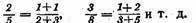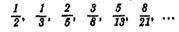 Ряд числителей и ряд знаменателей здесь — числа Фибоначчи, причем каждая из дробей (начиная с третьей) получается из двух предыдущих путем сложения их числителей и знаменателей: