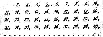 Требуется, предположим, выделить все простые числа в пределах от 2 до некоторого данного целого числа N. Выпишем сначала подряд все целые числа от 2 до N: 2, 3, 4, 5, …, N. Первое простое число 2. Подчеркнем его, а все числа, кратные двум (четные), зачеркнем. Первое из оставшихся чисел 3. Подчеркнем его как простое, а все числа «через два на третье» (то есть кратные трем) зачеркнем. Первое число из оставшихся теперь 5 (число 4 уже зачеркнуто). Подчеркиваем его как простое и зачеркиваем все числа «через четыре на пятое» (то есть кратные пяти) и так далее.
