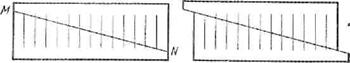 Начертите на прямоугольном куске картона 13 одинаковых палочек на равном расстоянии друг от друга, как показано на рисунке. Теперь разрежьте прямоугольник по наклонной прямой MN, соединяющей верхний конец самой левой палочки и нижний конец самой правой. Сдвиньте обе половинки прямоугольника вдоль линии разреза, как показано на рисунке.