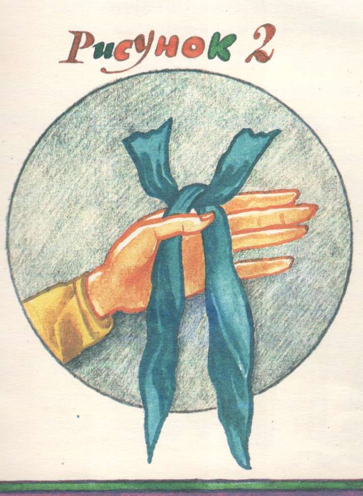 Возьмём косынку длиной 1—1,5 м и ещё небольшой кусок этой же косынки (20—25 см). Из куска косынки надо сделать кольцо, скрепив концы друг с другом нитками. Нитки должны быть того же цвета, что и косынка. Нужно вдеть косынку в косыночное кольцо. Держать косынку с кольцом надо так, как показано на рисунке 1, а ладонь должна быть обращена к зрителям тыльной стороной. Место скрепления концов на косыночном кольце лучше тоже запрятать в ладошку, зрителям не показывать. Фокусник ножницами разрезает косыночное кольцо (рис. 2) и связывает его концы двойным узлом.