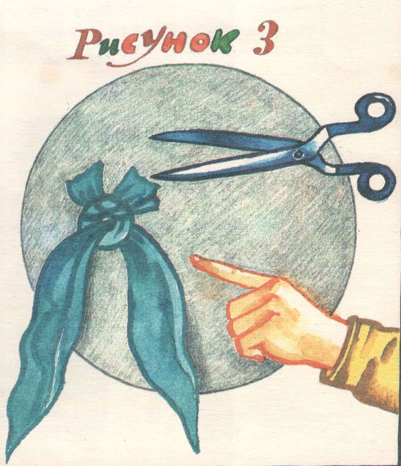 Волшебные слова произносят для большей убедительности и таинственности. Теперь можно срезать узел (рис. 3). Только делать это нужно осторожно, стараясь не повредить основную косынку. Затем косынку можно показать зрителям. Она целая!