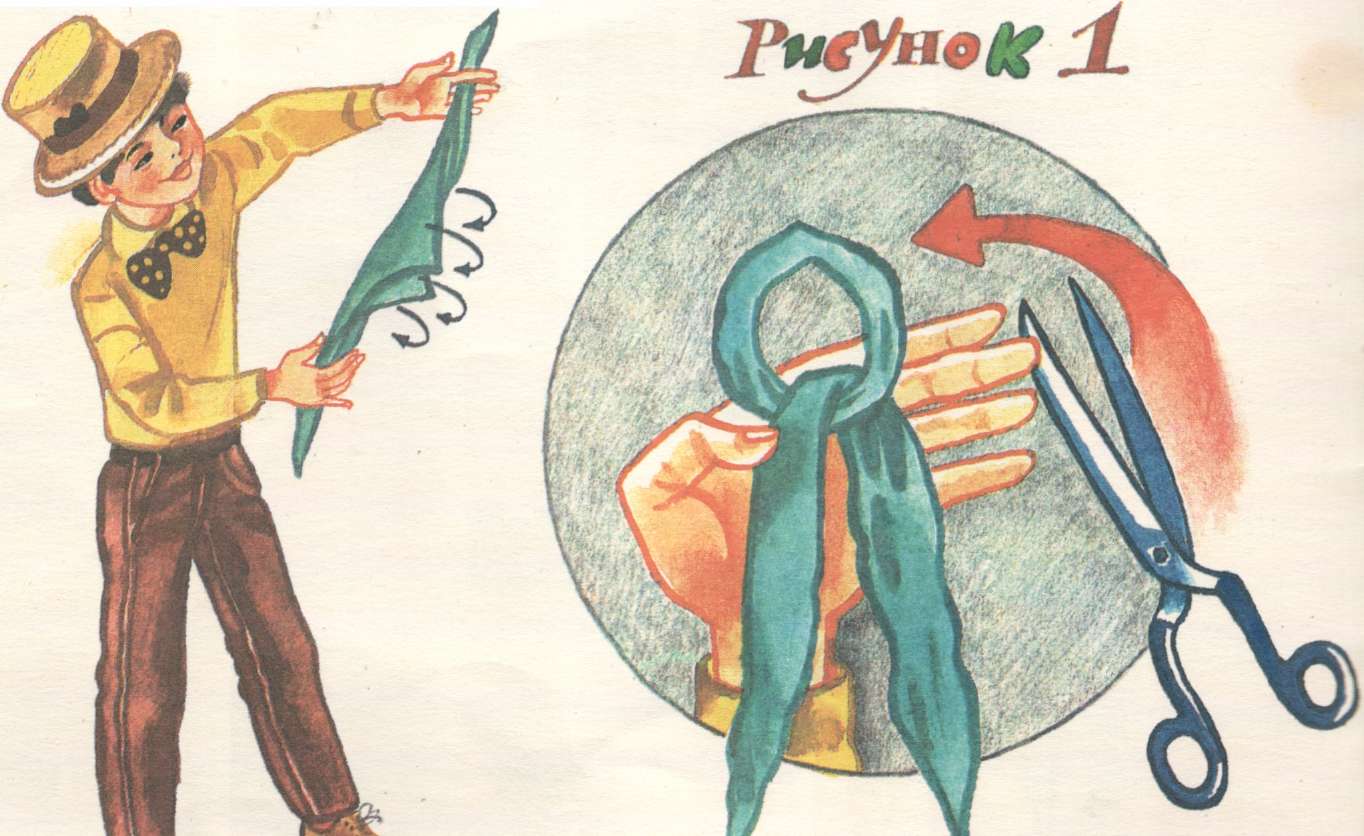 И сделать это может иллюзионист. Вот он держит в руке косынку, сложенную вдвое, берёт ножницы и разрезает косынку на две части. Затем связывает только что разрезанные концы двойным узлом и… произносит таинственное волшебное заклинание. Все ждут чуда! Сейчас из двух половинок вновь должна получиться целая косынка.