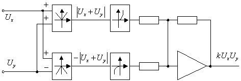 В параболических перемножителях результат формируется как сумма или разность некоторых вспомогательных функций квадратов от исходных аналоговых величин. Реализуется в подобных БУ одна из следующих математических зависимостей: