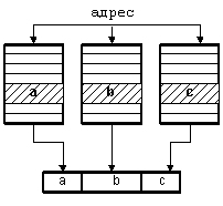 3. Пакетный доступ. Имеется 3 банка памяти с ячейками. На эти 3 банка подается один и тот же адрес. На выходе по одному и тому же адресу содержимое ячеек записываются в многоразрядное выходное слово. Это, так называемые, параллельные вычисления в пространстве.