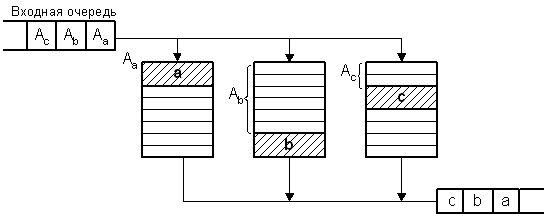 4. Конвейерный доступ. Используется и конвейеризация и распараллеливание. Имеется 3 банка памяти. Имеется очередь запросов, где записываются адреса. Эта очередь запросов поступает на все 3 банка памяти последовательно. Имеется выходная очередь, в которую передаются данные с выходов банков памяти. Первые данные получаются через время Dt, равное времени доступа к банку памяти. Каждый последующий через время, равное времени извлечения данных из входной очереди, но только в том случае, если запрашиваемые данные располагаются в разных банках.