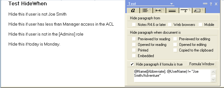 Текст может быть скрыт в зависимости от типа клиента, например, от клиента Notes 4.6 и выше или браузера или от пользователей, работающих с мобильного телефона или PDA. Это позволяет программировать различный интерфейс для разных клиентов.