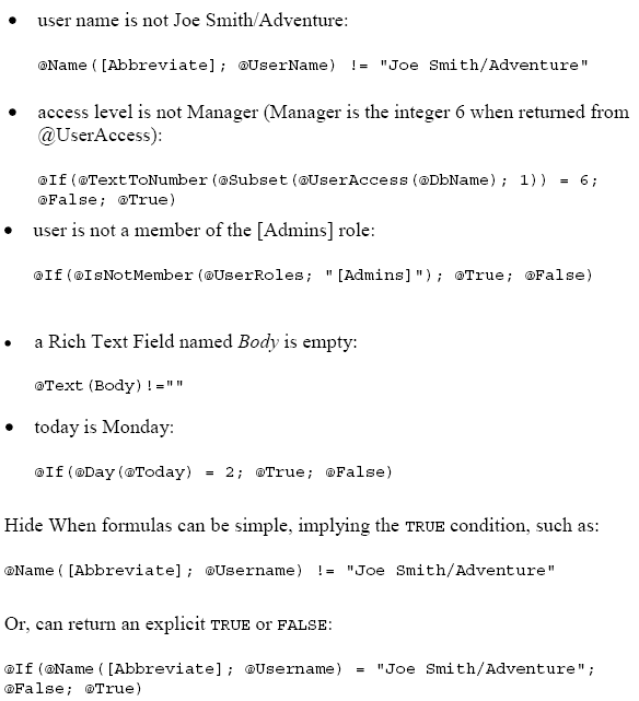 Скрыть, если формула приняла значение истина. Здесь обычно используются условия скрытия, базирующиеся на идентификации пользователя, типе клиента, версии Notes и т.д.