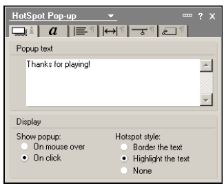 Пример на рисунке. Чтобы создать всплывающий текст выберите пункт меню Create — Hotspot — Text pop—up. Введите текст, который вы хотите видеть в качестве всплывающей подсказки. Вы можете настроить условия отображения подсказки – при нажатии или наведении мыши, а также стиль отображения.