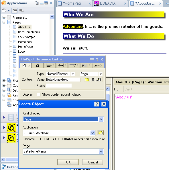 Выбор фреймсета и фрейма означает, что страница будет открываться в указанном фреймсете и фрейме данного фреймсета. Пример – база After Lesson 35, страница About Us.