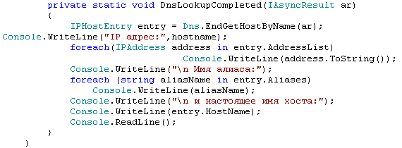Как только поиск DNS завершен, вызывается метод DnsLookupCompleted(), и получается результат поиска методом Dns.EndGetHostByName(). Затем идет обращение ко всем IP – адресам, как в предыдущем синхронном примере: