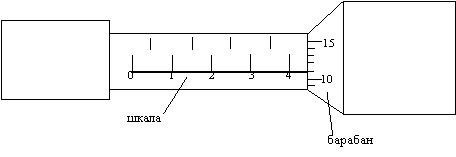 Микрометр (рис.4) состоит из двух основных частей: скобы и микрометрического винта, который проходит через отверстие скобы с внутренней резьбой. Напротив микрометрического винта на скобе находится упор. На микрометрическом винте закреплен полый цилиндр (барабан) с делениями по окружности. При вращении микрометрического винта барабан скользит по линейной шкале, нанесенной на стебле.