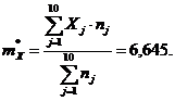 Частоты соседних интервалов дискретности следует объединить по три, получаются 10 групп интервалов дискретности. Далее формируется таблица, в столбцах которой располагается центры 10 групп интервалов, а в строках – экспериментальные значения соответствующей выборки. В ячейку, находящуюся на пересечении центра группы и значения рассматриваемой выборки, заносится число, соответствующее условию накрывания интервалов задания для данной выборки. Таким образом формируются таблицы для обеих выборок X и Y (таблицы 7.2 и 7.3).