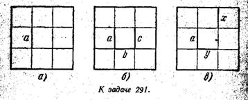 столбца, вы немедленно забираете все клетки этого столбца и делаете выигрышный ход в оставшемся прямоугольнике (см. п. 3 теории игры, стр. 291), Все 9 клеток ваши. Если противник в ответ на ваш первый ход (обвод стороны a) обведет любую вторую сторону (например, b) центрального квадрата (рисунок б), вы немедленно обводите третью (с), и противнику, чтобы не потерять все 9 клеток, ничего не остается, как взять центральную клетку и отдать остальные 8. Если же противник после вашего первого хода (а) обведет сторону какого-либо из трех квадратов крайнего правого столбца, например х (рисунок в), вы можете взять клетку вверху справа, ответить ему ходом у, и опять все 9 клеток ваши.