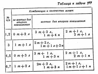 Из сказанного следует, что комбинация, оставляющая не взятой при втором взвешивании одну монету л, или одну монету т, практически неосуществима. В самом деле, тогда пришлось бы вторым взвешиванием испытывать 4 монеты одной группы и 3— другой, а если именно в этой комбинации находится фальшивая монета, то невозможно указанные монеты распределить по чашкам весов так, чтобы третье взвешивание позволило выделить фальшивую монету.