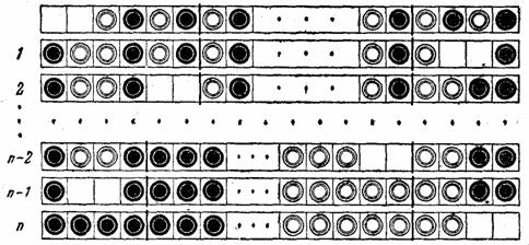 Произведем два перемещения, не затрагивающие внутренние n — 4 пары шашек, но обеспечивающие рядом с ними два свободных места (см. рисунок, положение после ходов 1 и 2). Еще два перемещения, которые нужны для решения задачи в случае, если бы только и были четыре выделенные пары, пока задерживаем и обращаемся к перемещению внутренних шашек, пользуясь образовавшимися слева двумя свободными местами. По предположению, это мы сумеем сделать в последующие n — 4 хода и, как подсказывает накопленный опыт, в результате получим слева черные шашки, а справа — белые (рисунок, положение после хода n — 2). Теперь опять обращаемся к четырем парам первоначально отделенных шашек и в два перемещения (рисунок, ход n — 1 и ход n) завершаем решение.