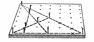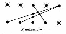 Указание к решению задач первого варианта игр. Любое из возможных решений задачи о перемещении четырех шащек (из десяти, расположенных в 2 ряда) так, чтобы образовалось 5 рядов по 4 шашки в каждом, можно легко и быстро получить при помощи несложных геометрических построений. Замените шашки точками на листе бумаги и зачеркните какиенибудь три верхние и одну нижнюю точки. Первую из оставшихся двух точек верхнего ряда соедините прямыми с какимилибо двумя точками нижнего ряда, а вторую точку верхнего ряда — с остальными двумя точками нижнего ряда (см. рисунок). Избегайте таких комбинаций точек, которые приводят к параллельным линиям,и тогда вы получите 4 точки пересечения проведенных линий. В этих точках пересечения и следует поместить 4 шашки, соответствующие зачеркнутым точкам.