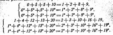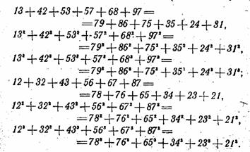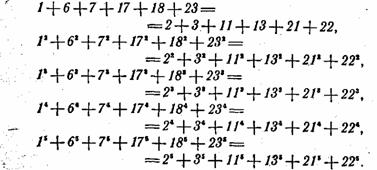 Не хотите ли ознакомиться, например, с одним из новых, очень пышных «созвездий». Суммы всех степеней, от первой до пятой, шести чисел: 1, 6, 7, 17, 18 и 23, равны суммам тех же степеней других шести чисел: 2, 3, 11, 13, 21 и 22: