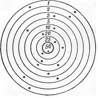 Три мальчика — Андрюша, Боря и Володя — стреляли из мелкокалиберных винтовок по специальной мишени, изображенной на рисунке. Каждый из мальчиков сделал по 6 выстрелов. Места попаданий в мишень отмечены на рисунке точками. Когда подсчитали результаты, оказалось, что каждый из мальчиков выбил по 71 очку. При этом из всех 18 выстрелов только один дал попадание в центральный круг мишени (50 очков).