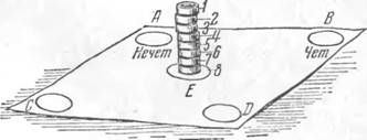 Можно, скажем, шашку с цифрой 1 положить на шашку с цифрой 3, или шашку с цифрой 3 на шашку с цифрой 7, шашку с цифрой 2 на шашку с цифрой 6, но не наоборот, и нельзя положить шашку с цифрой 1 на шашку с цифрой 2, или шашку с цифрой 4 на шашку с цифрой 7, так как тогда оказались бы вместе «чет» и «нечет».