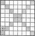 В одной из белых клеток на рисунке я поставил звездочку. Разместите в белых клетках еще 7 звездочек так, чтобы никакие 2 звездочки (из восьми) не находились на одной горизонтали или вертикали, или какой-либо диагонали. Решать задачу, конечно, надо путем проб, поэтому дополнительный интерес задачи еще и в том, чтобы в процесс необходимых испытаний внести известную систему.