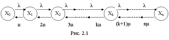 Из Xk в Xk+1 (k=0 …… n-1) систему переводит один и тот же простейший поток – поток требований с интенсивностью ?. Из состояния Xk+1 в Xk систему переводит простейший поток обслуживания с интенсивностью ?. Если занято 2 канала, то суммарный поток обслуживания будет вдвое интенсивнее, т.е. из X2 в X1 система переводится с интенсивностью 2?, если занято k каналов, то поток обслуживания имеет интенсивность k?.